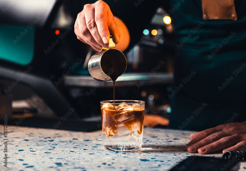 Close up of male barista hand making coffee tonic.
