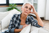 Tired sad mature woman suffering from menopause at home. Depressed exhausted Caucasian middle-aged woman missing kids, thinking about being fired abortion pension