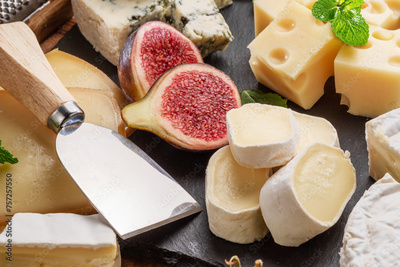 Variety of sliced cheeses with fruits, mint, nuts and cheese cutting knives.