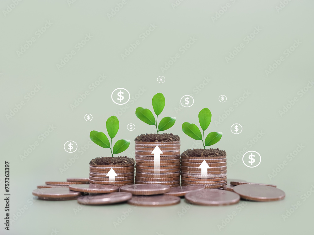 Plants growing up on stack of coins with arrow rising and dollar coin icons. The concept of saving money, Financial, Investment and Business growing.