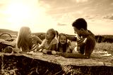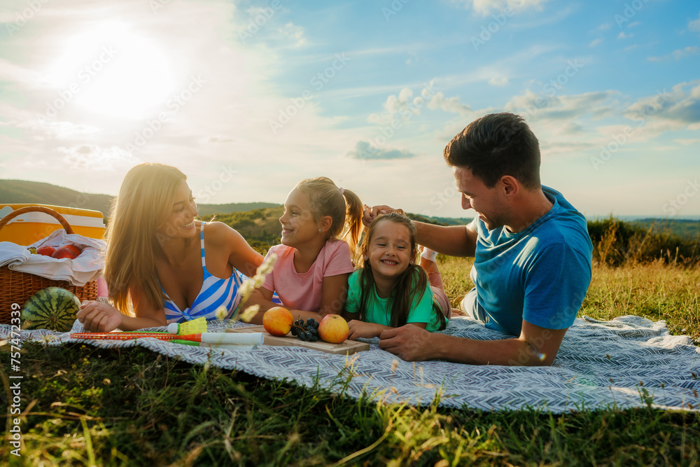 The family is lying on a blanket surrounded by fruit, having a picnic for the last day of summer vacation