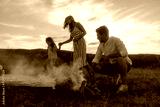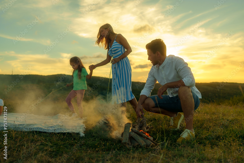 A man builds a campfire while a mother and daughter are in the background, they came to watch the sunset and the stars