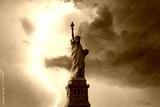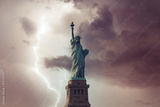 View on Statue liberty from Hudson river on the stormy sky with lightning strike