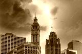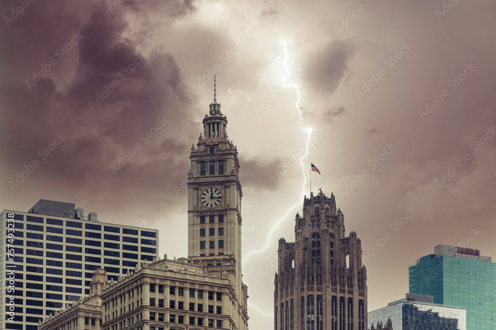 Chicago skyscrapers at rainy day with stormy sky with lightning strike background