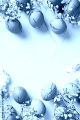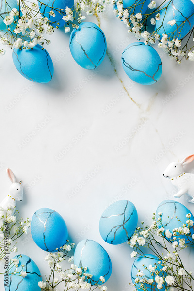Blue elegant Easter eggs with minimalist florals on a marble background, top view