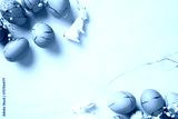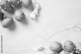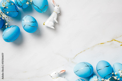 Blue Easter eggs with rabbits and spring flowers on marble table.