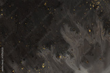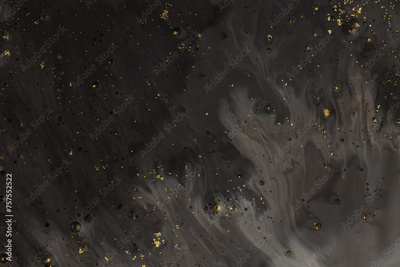 Flow pour oil and acrylic color painting blot. Abstract black and gold glitter texture background.