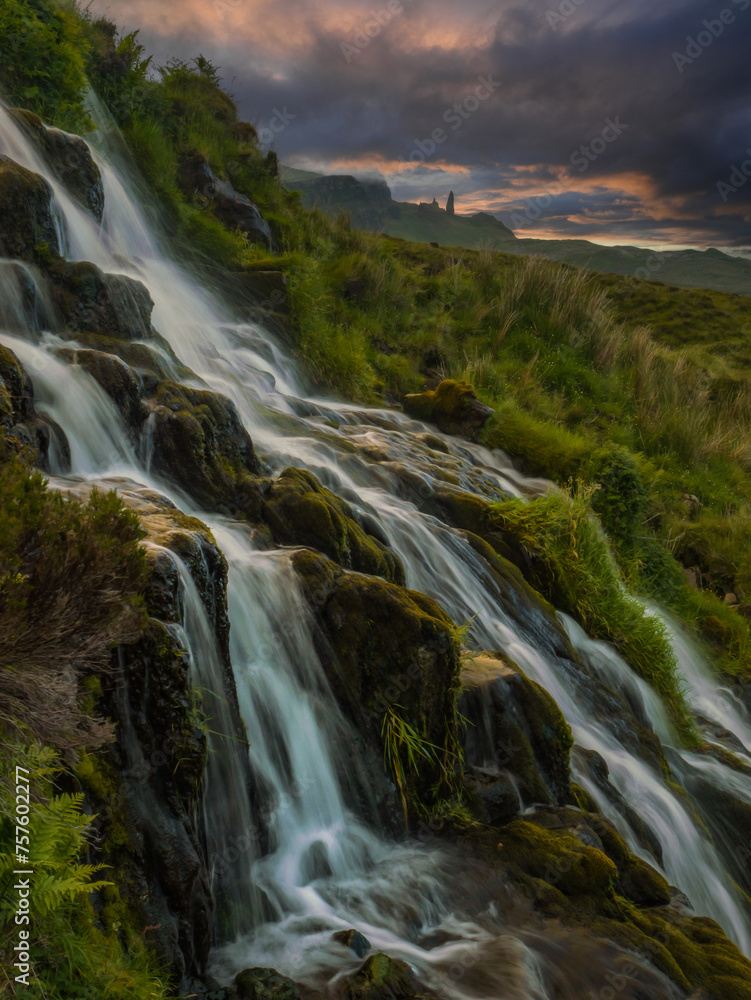 Otherworldly scenery with a beautiful cascading waterfall and Old Man of Storr