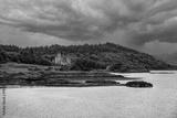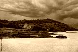 An old medieval castle raised above the lake in the embrace of a lush forest
