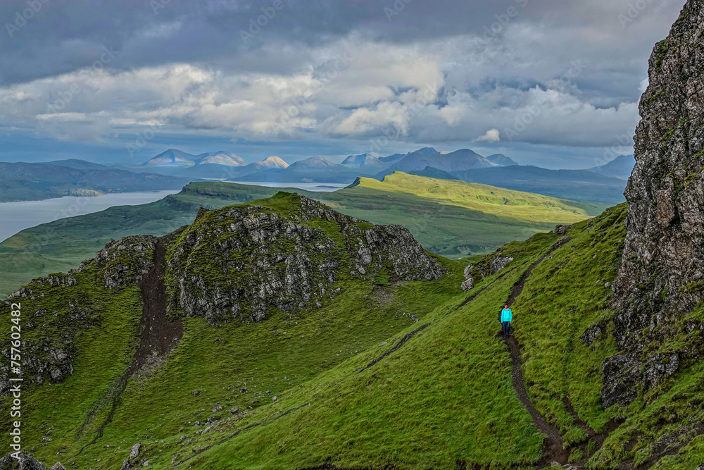 AERIAL: Hiker admires spectacular views while walking up to the Old Man Of Storr