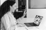 Video call, group brainstorm. Successful brazilian or hispanic businesswoman, team leader, sitting at workplace in the office in front of a laptop, having online video conference with multiracial team