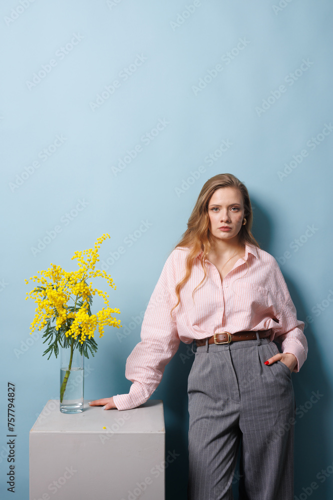 girl holds a mimosa branch in her hand and puts it in the water, spring concept