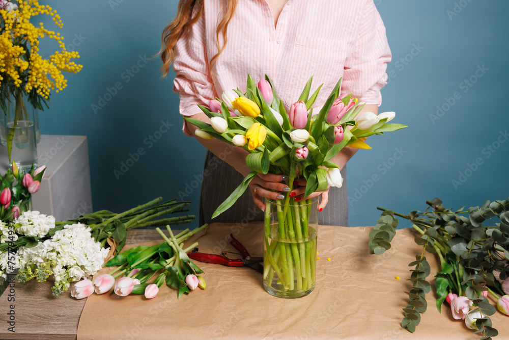 girl florist collects a bouquet of spring tulip flowers on a clean blue background