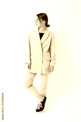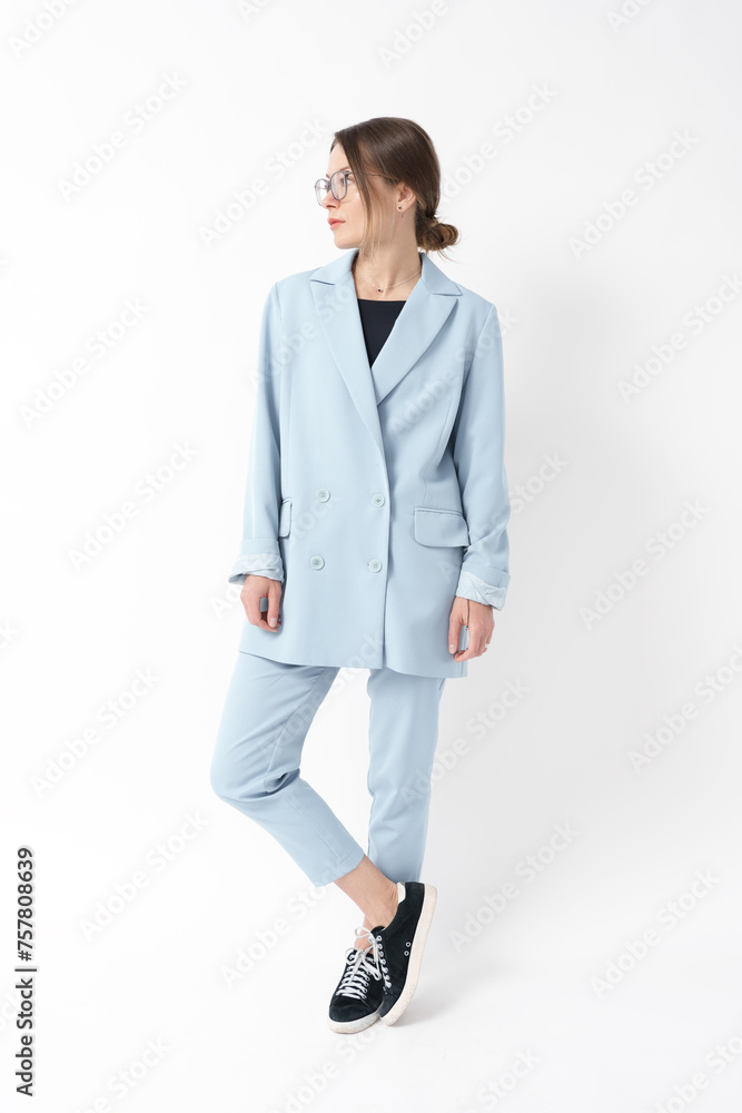 Fashionable young woman in a trendy pastel suit and sneakers posing against a white backdrop.