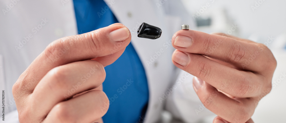 Hearing aid battery replacement. Audiologist showing ITC hearing aid and battery for it, holding them in her hands in front of him