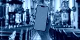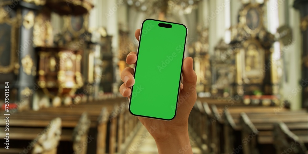 Hand-held smartphone with a green screen in a church interior