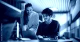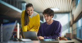 Diverse Couple of Friends and Classmates Working on a Collaborative Team Project in an Academic Library. Young Multiethnic Students Using Laptop Computer, Discussing Upcoming Lecture Topics