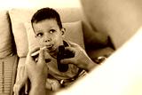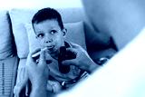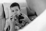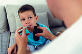 Happy boy taking cough syrup from his parent at home. Close up of small boy taking cough syrup from spoon.