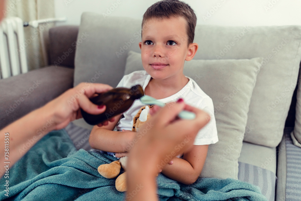 Happy little boy being feed with medical syrup by his unrecognizable parent at home.