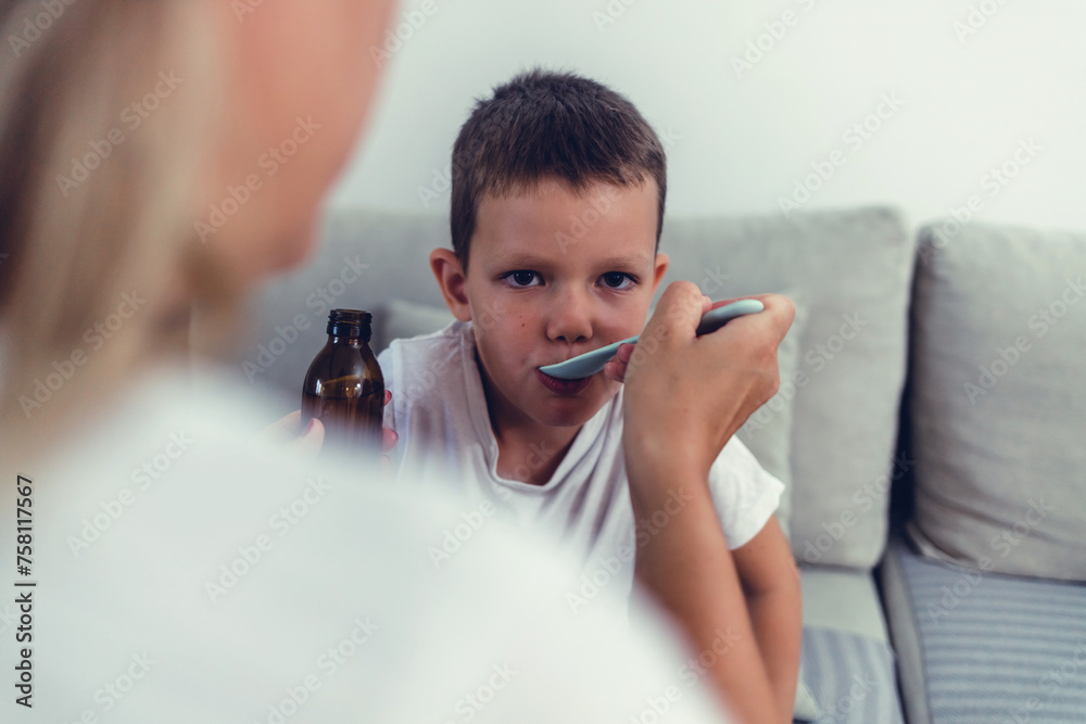 Little boy taking a spoon of medicine. Mother giving her son cough syrup at home.