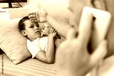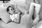 Sick little boy in bed while his father uses a hand to check his temperature. Caucasian single parent feeling son's forehead. Cute child feeling ill while his father checks fever.