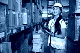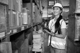 portrait worker working on tablet and looking at cardboard box on shelf in warehouse storage