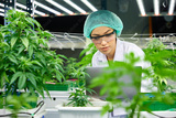 female scientist looking and checking hemp or cannabis plants in the greenhouse