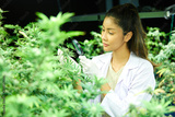 scientist using magnifying glass and checking hemp or cannabis plants in the greenhouse
