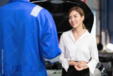 woman customer meeting mechanic and talking about how to fix a car in automobile repair shop
