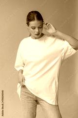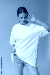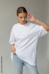Beautiful blonde girl in a white oversized T-shirt and blue jeans posing on a gray background