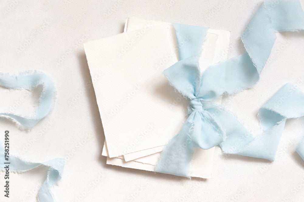 Cards tied with a light blue ribbons on white table top view, copy space, wedding stationery mockup