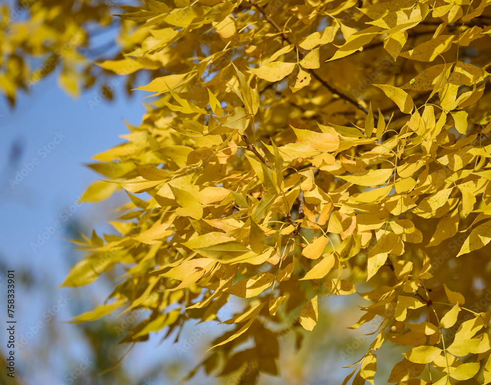 Yellow leaves on a Pennsylvania Ash tree on an autumn day, Ukraine