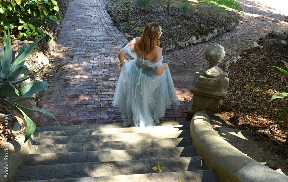 full length portrait of beautiful female model wearing blue fantasy ballgown, like a fairytale princess. walking around a real stone castle palace location with balconies and staircases.