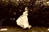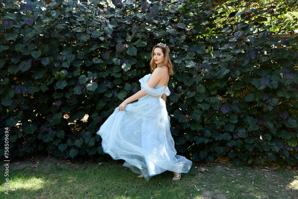 full length portrait of beautiful female model wearing blue fantasy ballgown, like a fairytale elf princess. Holding. standing pose in front of wall of vines in forest location.