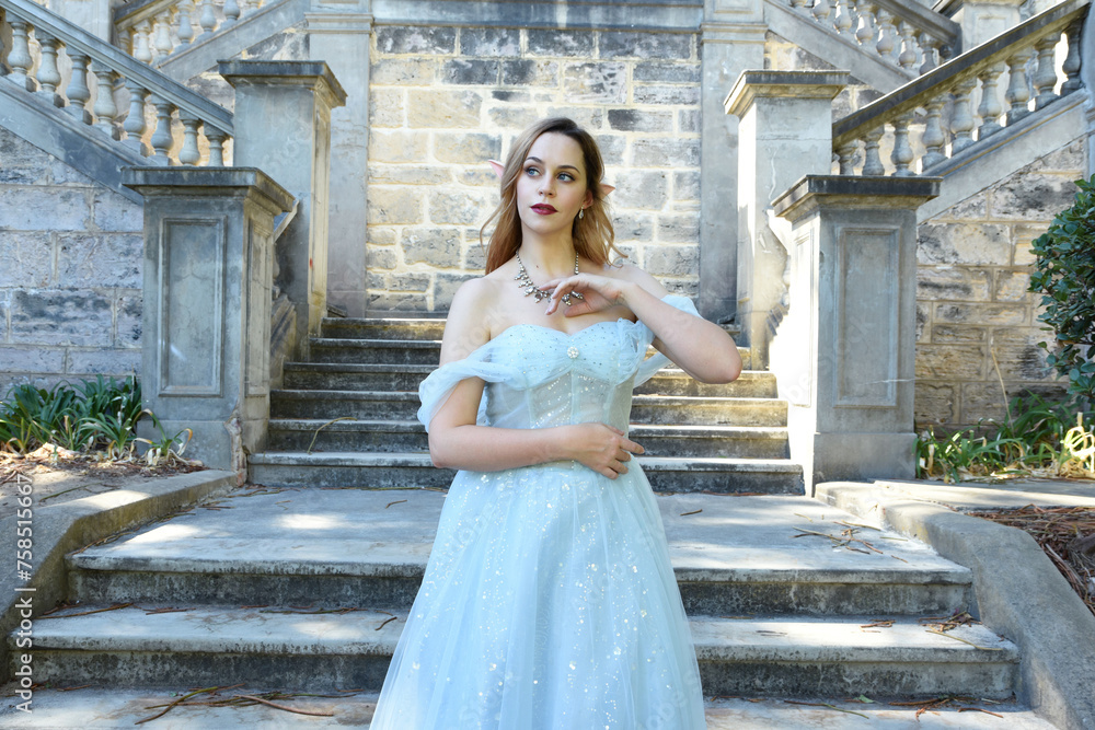 Close up portrait of beautiful female model wearing blue fantasy ballgown, like a fairytale elf princess. Elegant pose, gestural hands reaching out, on the terrace of a romantic castle staircase