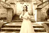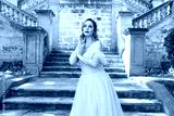 Close up portrait of beautiful female model wearing blue fantasy ballgown, like a fairytale elf princess. Elegant pose, gestural hands reaching out, on the terrace of a romantic castle staircase