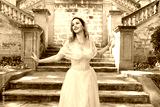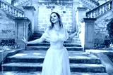 Close up portrait of beautiful female model wearing blue fantasy ballgown, like a fairytale elf princess. Elegant pose, gestural hands reaching out, on the terrace of a romantic castle staircase