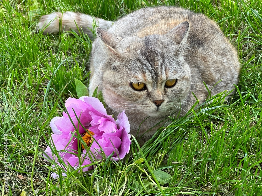 Cat lying down in grass with peony flower.