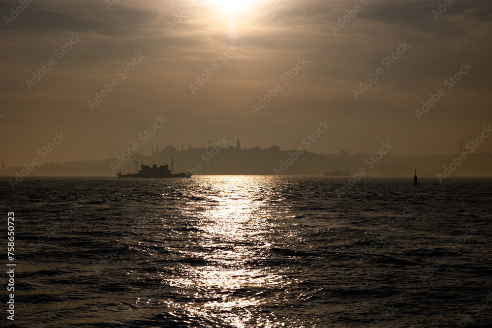 Istanbul view on a foggy day. Ferry and historical peninsula of Istanbul