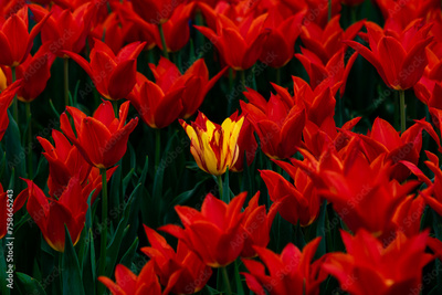 Yellow tulip among the red tulips. Diversity concept photo.