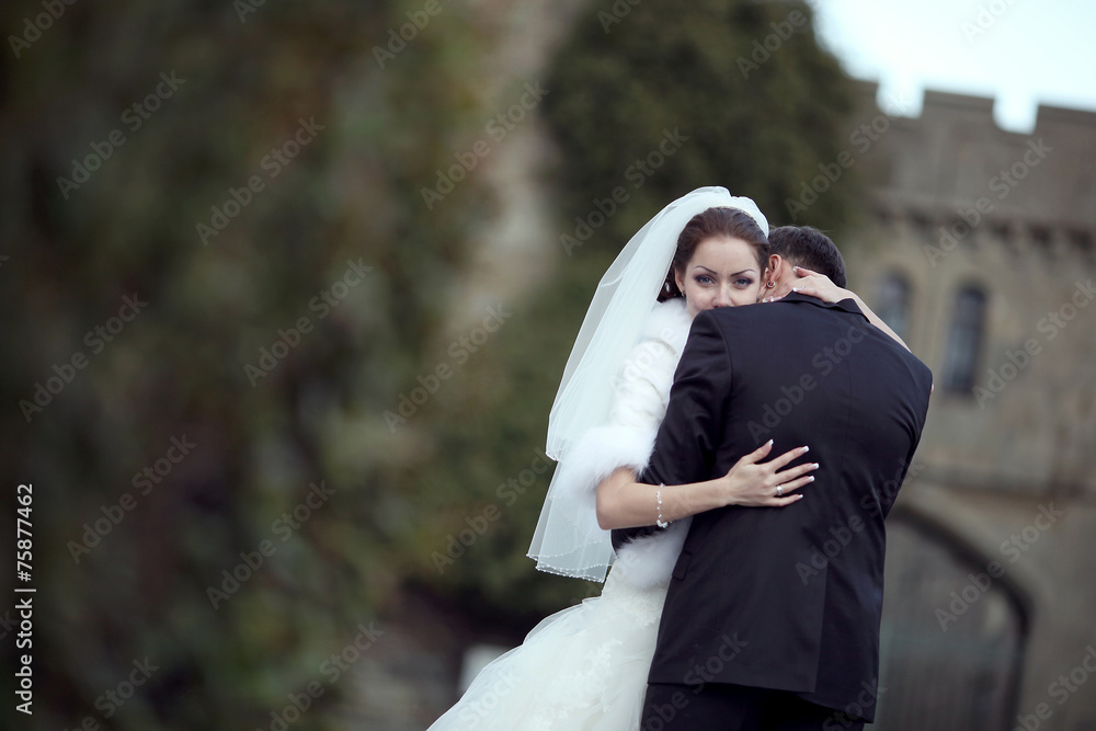 Happy couple embracing. Wedding beautiful bride and groom.