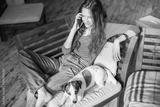 Smiling teenage girl sitting on couch and looking at phone screen
