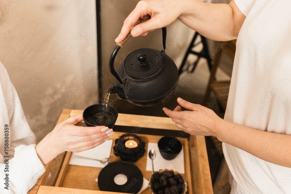 Health tea in hands of a massage therapist for female client of spa center after massage. Herbal tea for spa