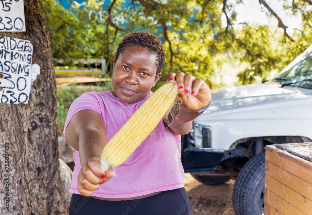 african woman street vendor selling corn on a street in the city on the sidewalk, car in the background