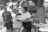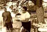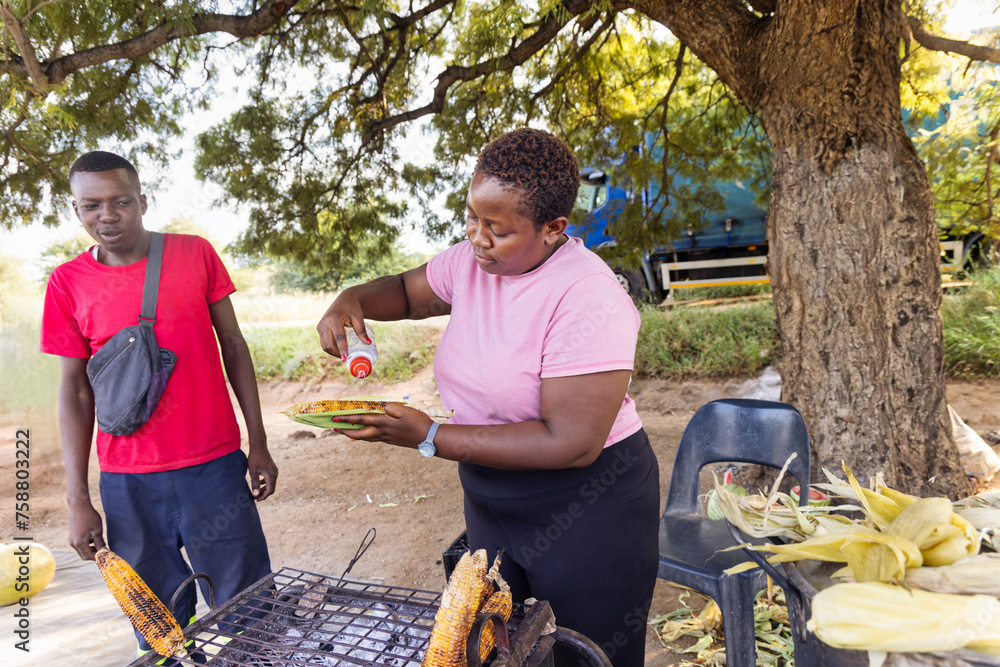 african woman street vendor selling grilled corn to a man client on a street in the city on the sidewalk, car in the background