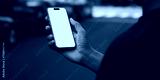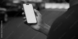 Black African-American hand displays a modern smartphone with a blank screen