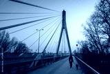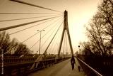 Wide-angle perspective of a suspension bridge at sunset and a person walking a dog