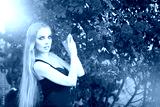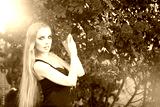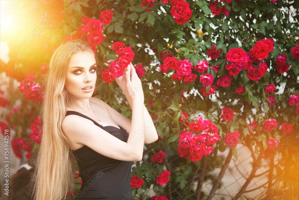 Beautiful fashionable woman with red lips makeup posing outdoor, in blooming rose garden.