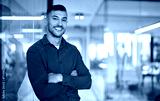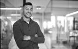 Confident young smiling Latin business man leader looking at camera standing arms crossed in office. Successful happy businessman manager, professional executive or male entrepreneur, portrait.