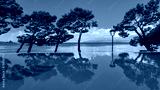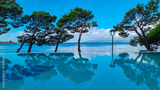 Infinity pool in luxury hotel along the promenade in coastal town Makarska, Split-Dalmatia, Croatia, Europe. Coastline of Makarska Riviera, Adriatic Sea. Dreamlike atmosphere. Vacation summer concept
